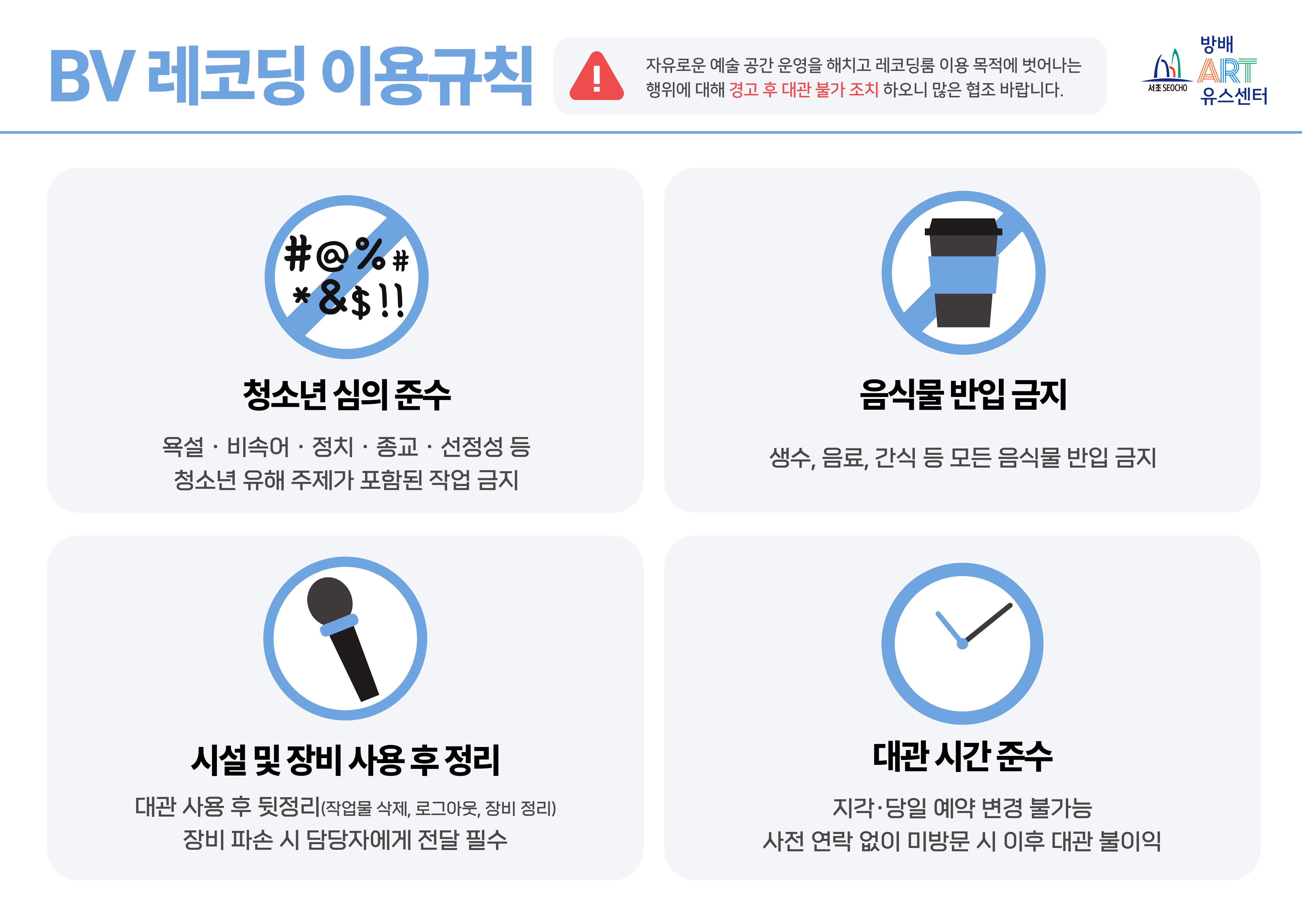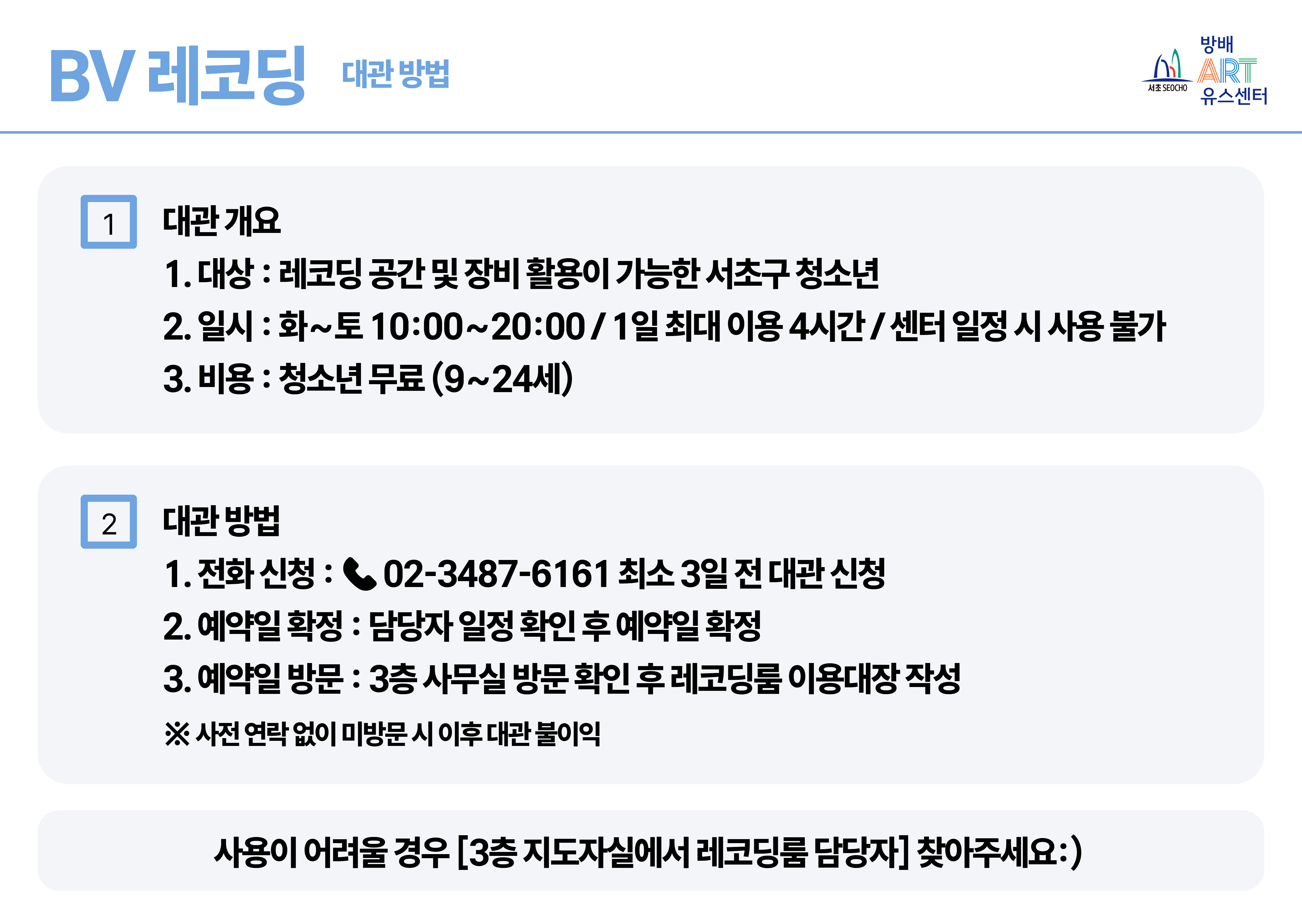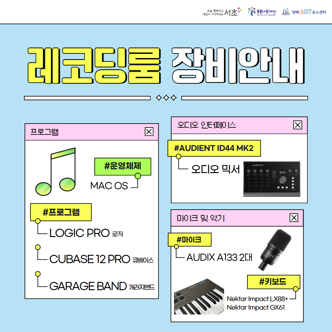 공간 및 장비 활용이 가능한 서초구 청소년 대상 무료 대관을 진행하고 있으니, 많은 관심과 문의 바랍니다💖