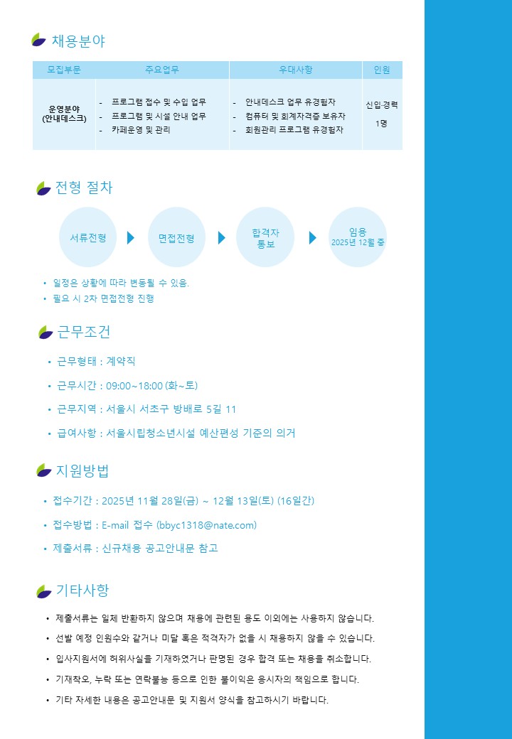(2025-004호) 방배유스센터 신규 채용 공고(운영분야)