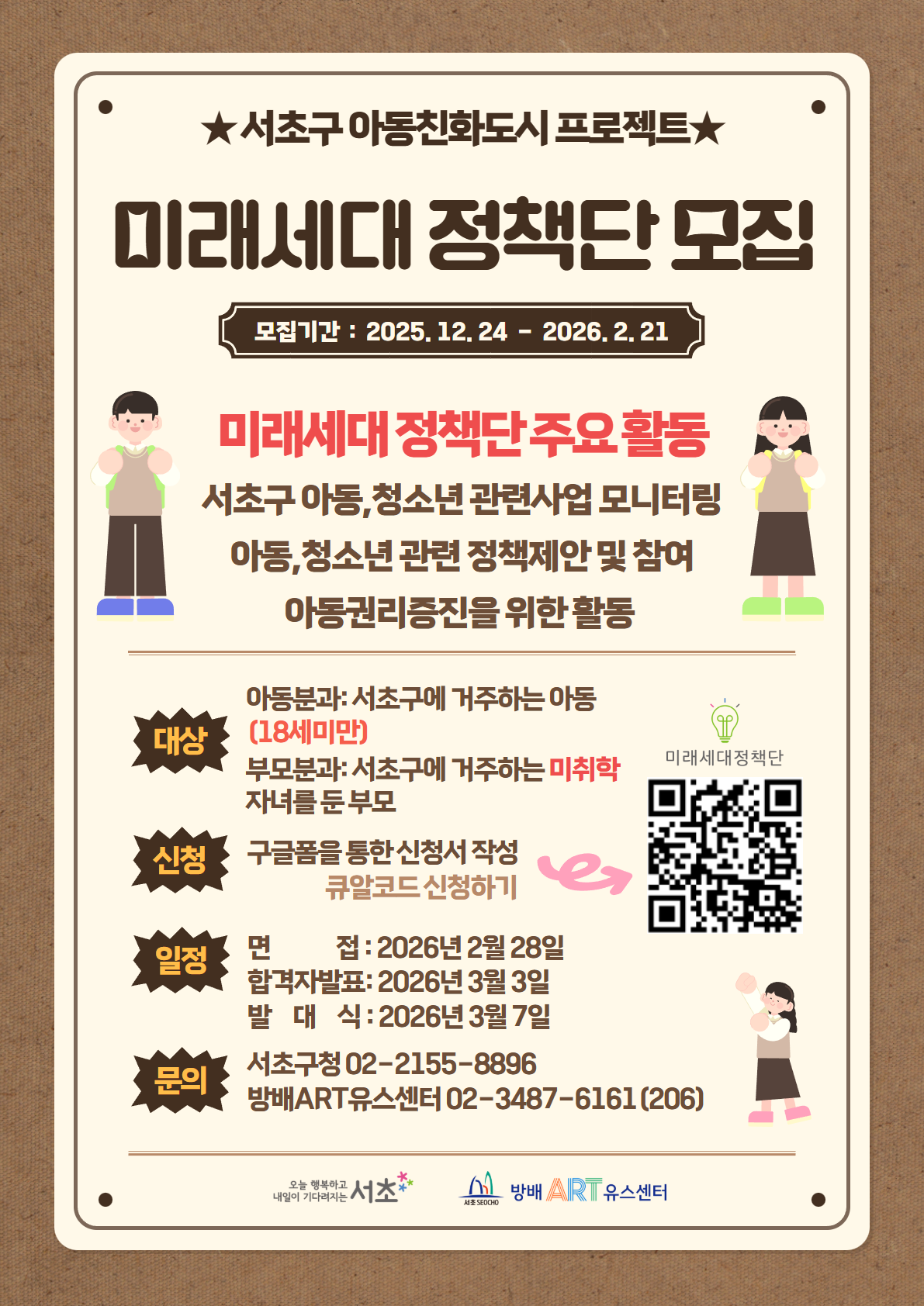 서초구 아동친화도시! 2025년도 서초구 미래세대정책단 위원을 다음과 같이 모집합니다.